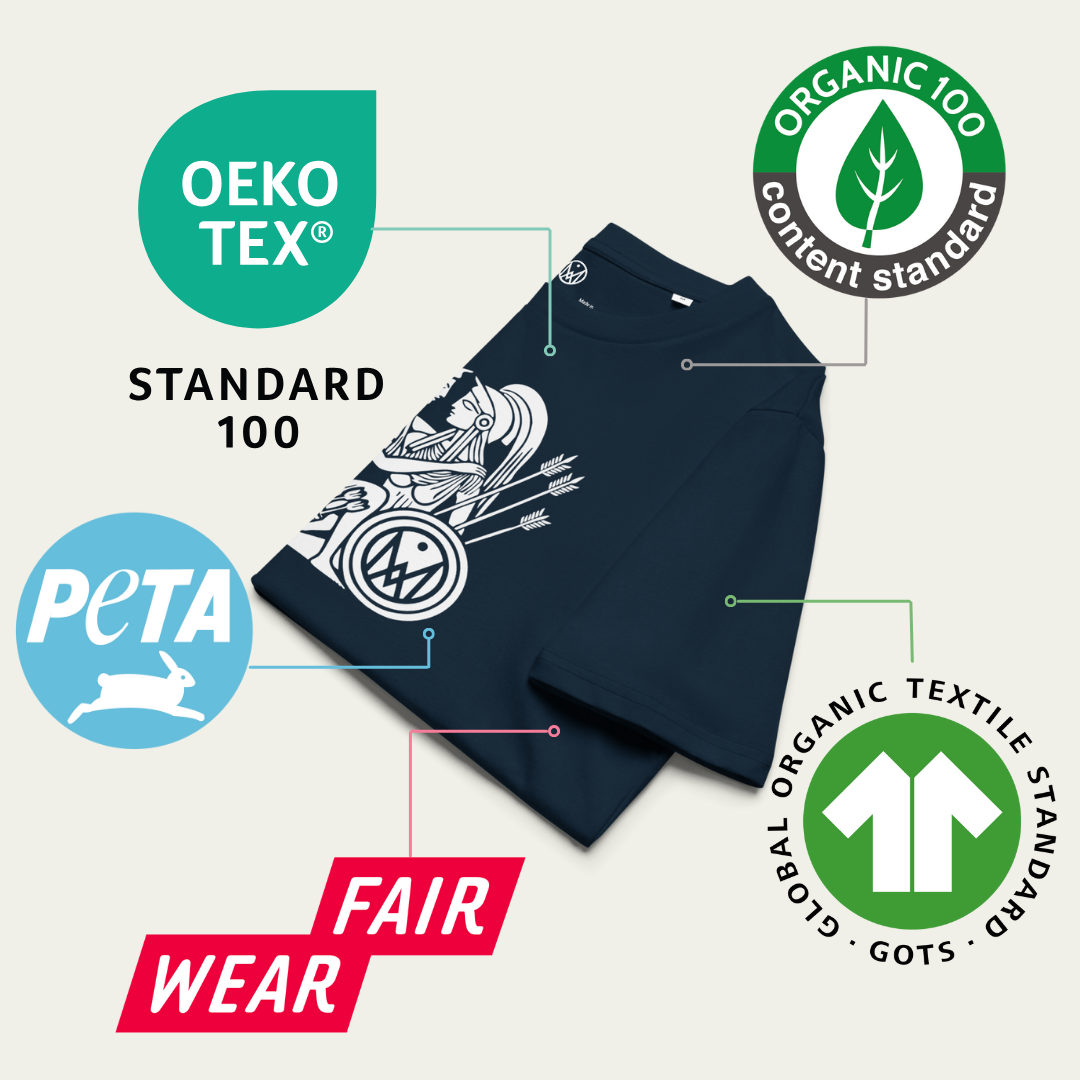 Ce t-shirt est le fruit d’une collaboration avec les ateliers Stella/Stanley, spécialiste des vêtements écoresponsables haut de gammes et certifiés Fair Wear (assurant des conditions de travail et de rémunération éthiques, sûres et équitables pour les artisan(e)s qui les confectionnent).