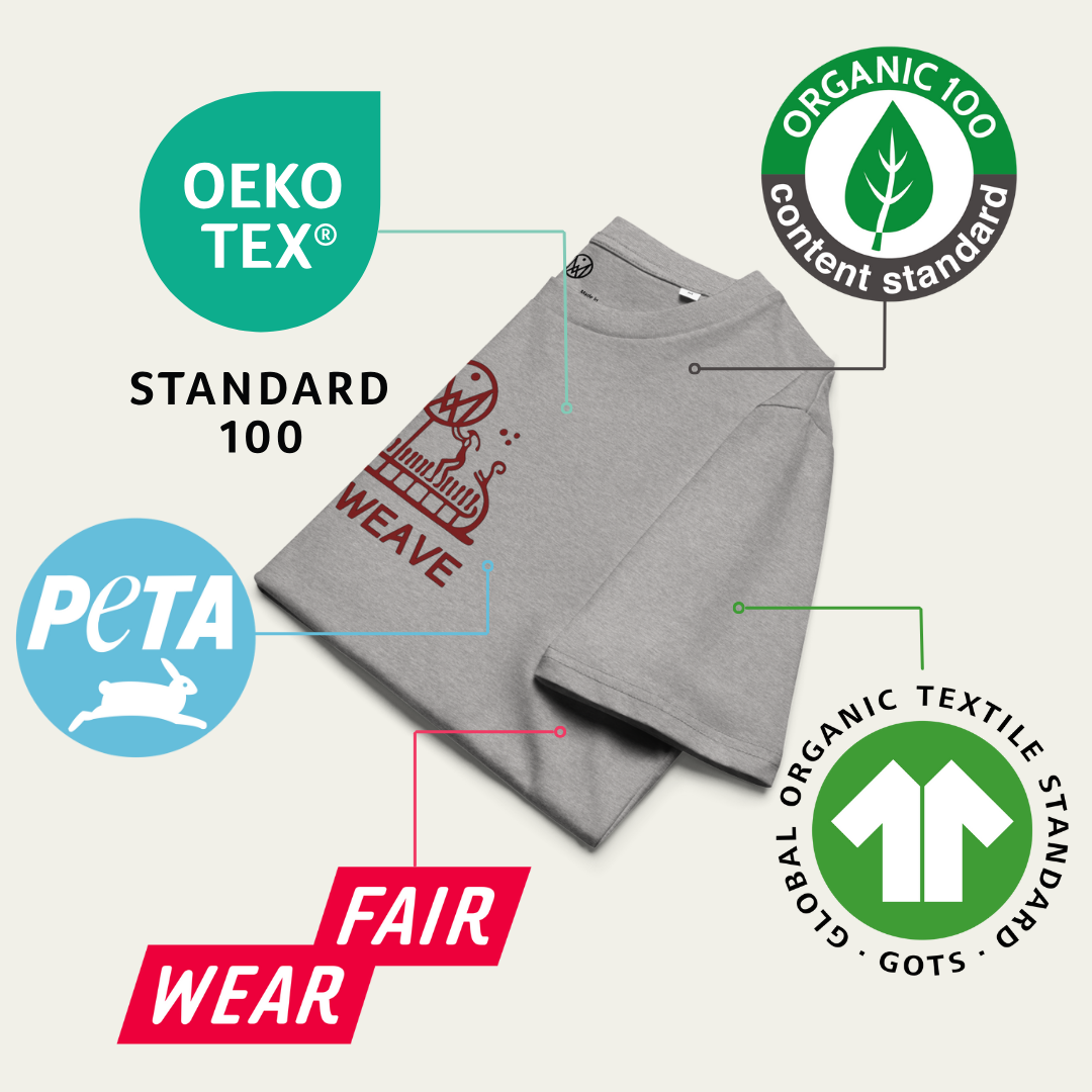 Le tissu de ce produit est également approuvé par l'association PETA (People for the Ethical Treatment of Animal) et certifié par : OCS (Organic Content Standard), GOTS (Global Organic Textile Standard), OEKO-TEX Standard 100.